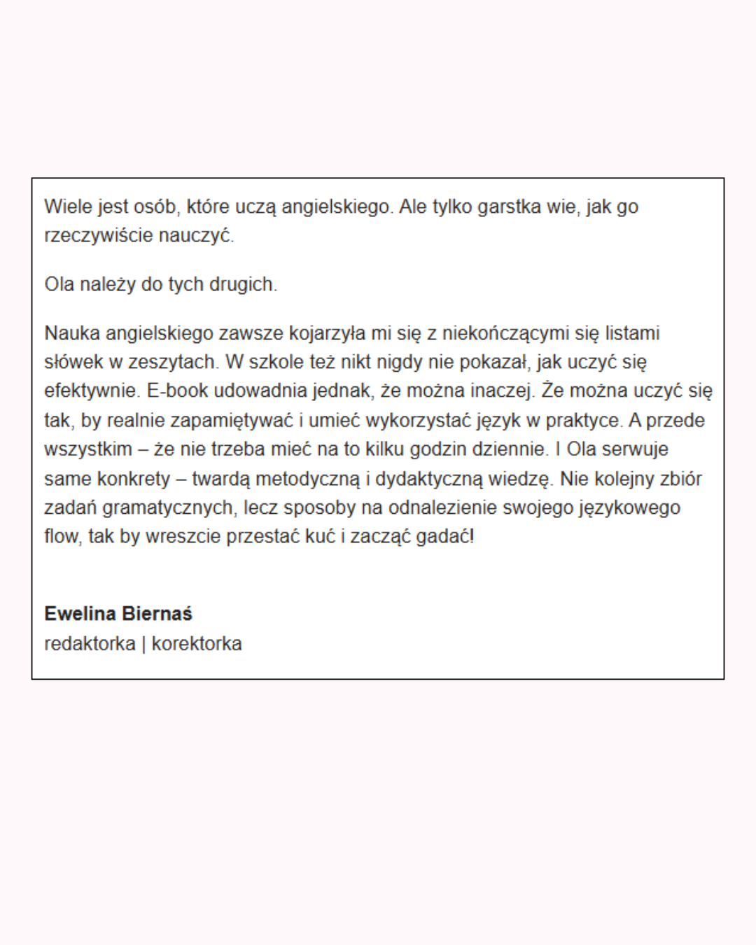 Na podstawie moich wieloletnich doświadczeń z językami obcymi oraz nauczaniem angielskiego wypracowałam strategie, które pozwolą Ci wycisnąć Twój potencjał do maksimum i zdejmą z Ciebie ciężar presji, jaki wtłoczyły nam do głów lata szkolnej nauki i niewspierające otoczenie. Wzniesiesz swój językowy rozwój na kolejny poziom z mądrze ukierunkowanym wysiłkiem i satysfakcją płynącą z rezultatów.
